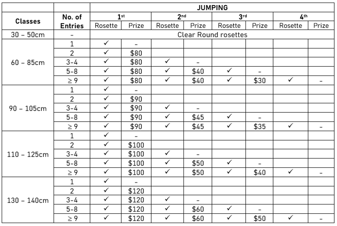 - For classes with 1-2 entries, competitors are required to score a minimum of 63% in dressage, or no more than 6 penalties for showjumping to receive cash prizes